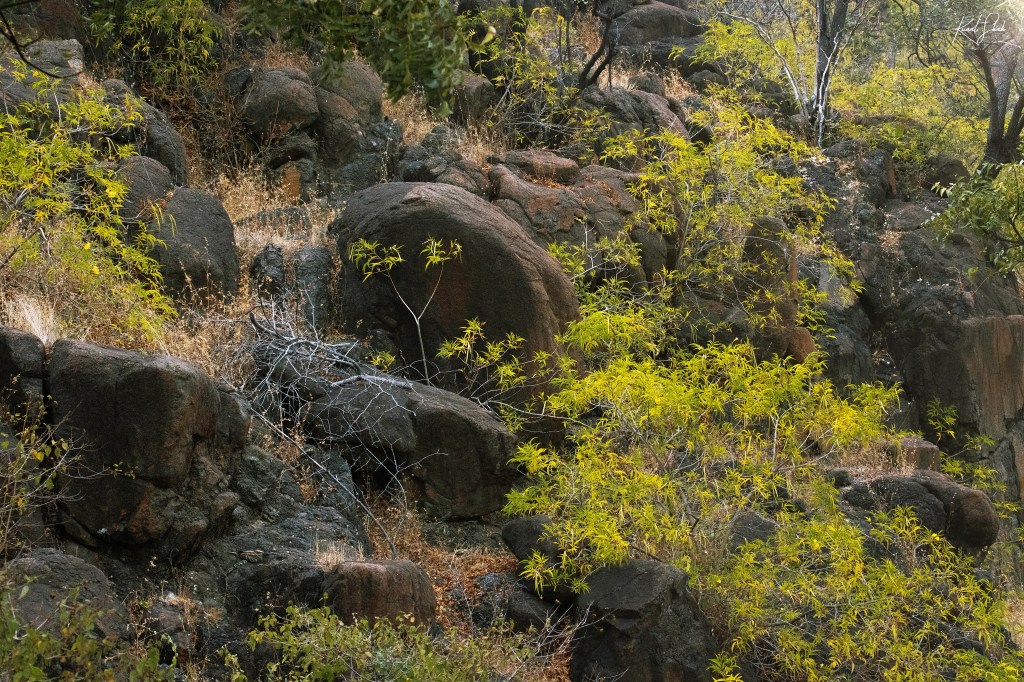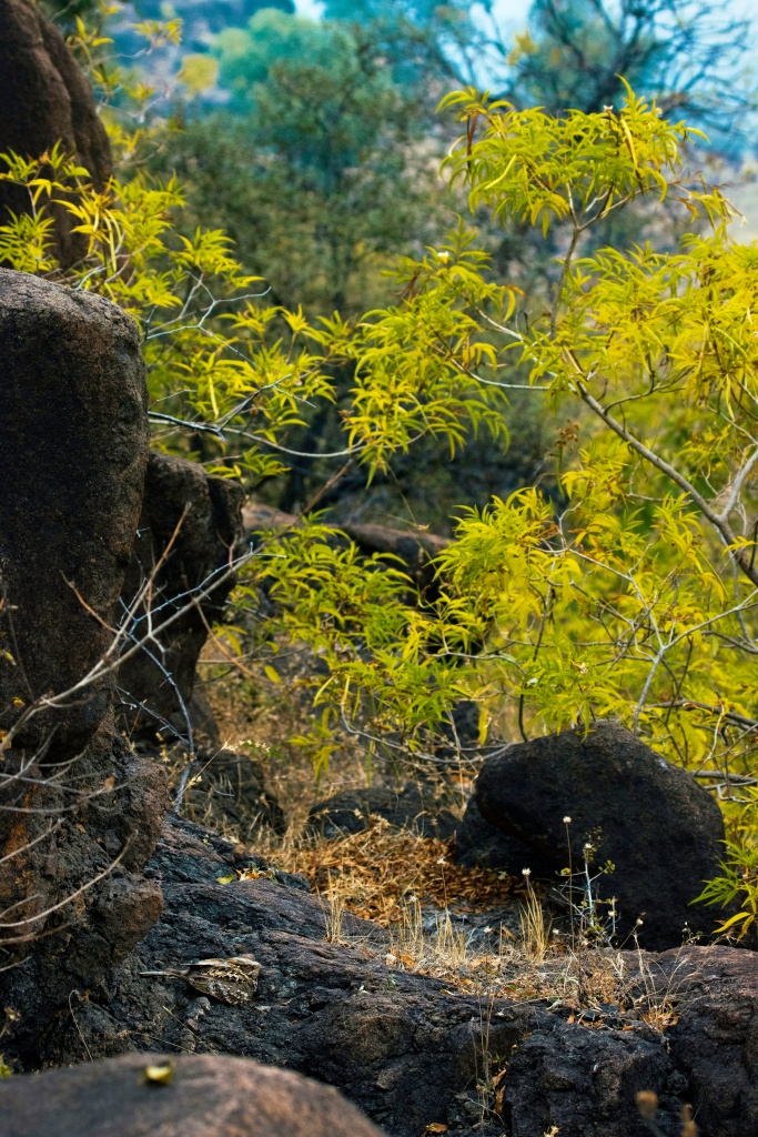 We could have directly gone to that place in less than 2 minutes because it was not that far away in reality, just far for the camera. But we played around that area for one and a half hour, tactfully deciding our route to approach the Nightjar and then setting up checkpoints in between. As in, first we will go upto that rock, click photos from there, wait for 20 minutes, then go to that tree, wait there for another 15 minutes and so on. Now to avoid a direct approach and getting in sight of the Nightjar, we decided such an approach that we would get something in front of us always to cover us, such as a huge rock, a shrub etc. For that, we had to climb the rest of the hill again, walk a few steps and get down half way again.