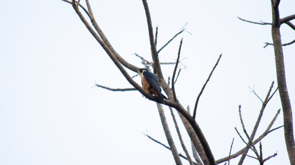 We weren’t exactly at the top of the hill though. Rather, it was the edge of the quarry, just a few meters below the top. I never usually pick up the camera and chase a bird when I’m with my non-birding friends, but I had to do it this time for it was a Peregrine Falcon! I immediately started clicking photos but it was far away and it was actually sitting diagonally upward to us. So the background was completely white due to the sky. But I couldn’t complain because this was the first time I saw a Shaheen Falcon perched! Yes, I realised that it was not a Peregrine Falcon but it’s twin brother, the Shaheen Falcon. But it was still a rarity!