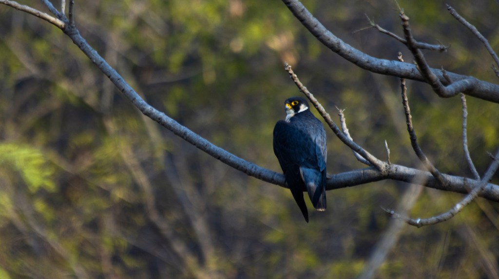 We carried on with our talks. All of a sudden, something dived from the rocks of the quarry and flew right over us with astonishing speed. That was the time when the birder in me woke up. The bird took a U-turn and came back and I realised that it was a falcon! A Peregrine Falcon! A rarity! The fastest flying bird in the world! I crossed my fingers and started chanting ‘please perch perch perch perch perch…’ and it perched! On a short dry tree at the top of the hill, along the edge of the quarry. I thought to myself, ‘Oh my God, I wonder where my luck is going today! Thanks to all the superpowers out there’.